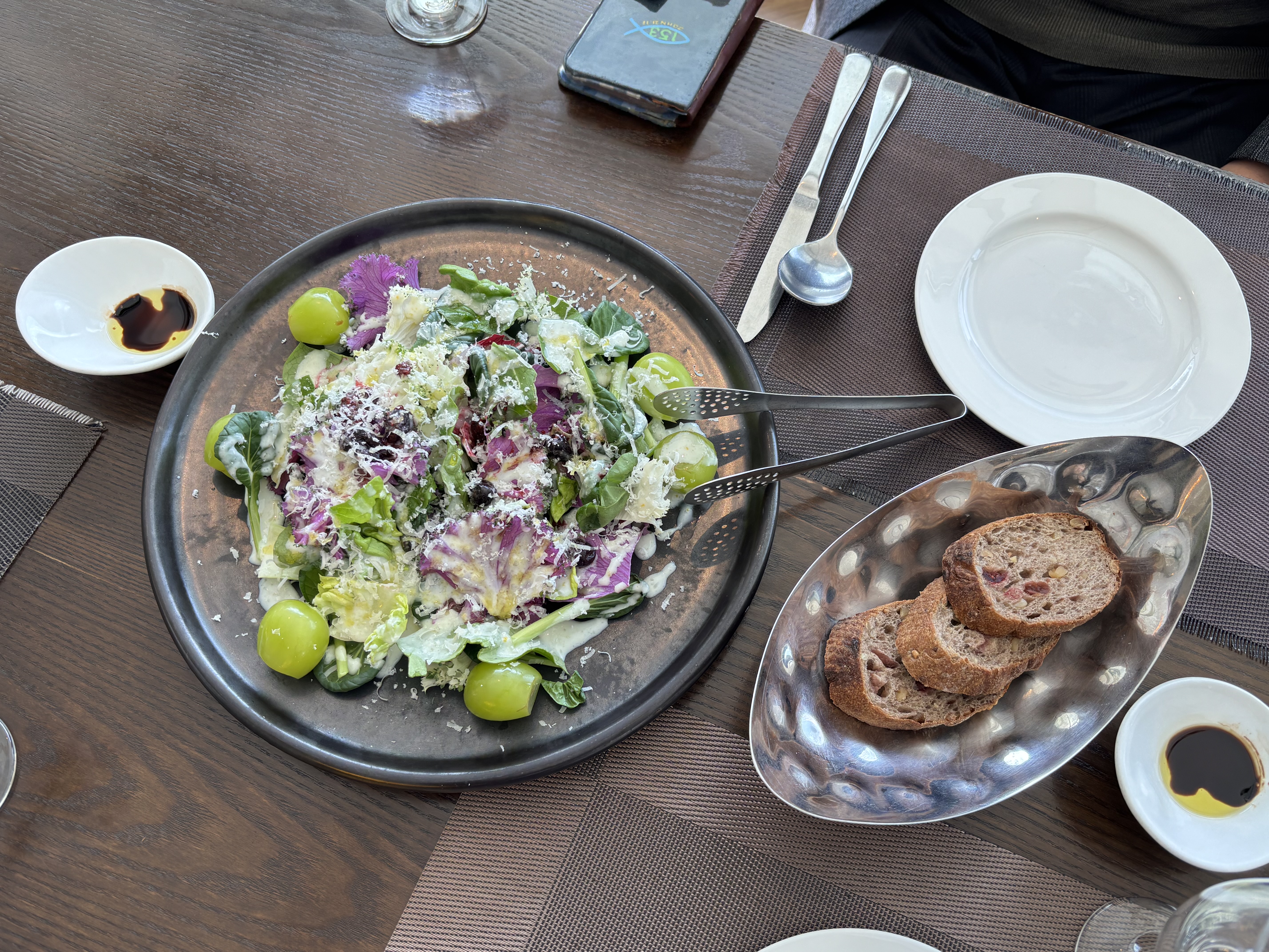 점심세트 메뉴는 샐러드+본식+차/커피인데요. 먼저 샐러드와 식전 빵이 나왔거든요. 식전빵은 촉촉하니 쫀득했고요. 저는 샐러드를 그렇게 좋아하진 않는데, 여기 샐러드 소스가 되게 특이했어요. 새콤했달까요. 뭔가 복분자의 맛도 들어가 있는 것 같았고요. 여기 샐러드가 전 좀 계속 생각나더라고요?